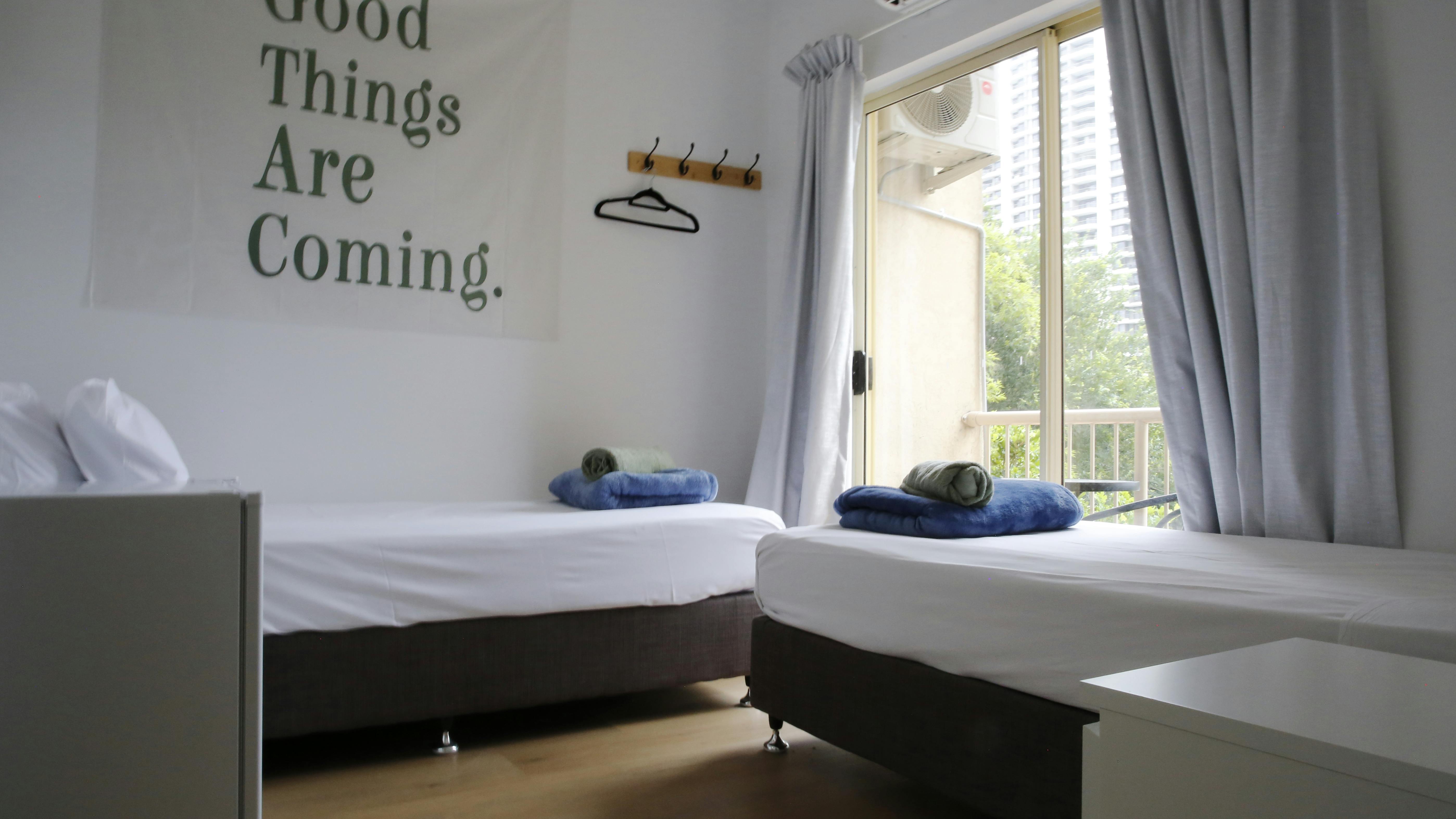 It features two single beds with fresh linens, perfect for a relaxing stay for two guests. The highlight is the private balcony, which provides a peaceful outdoor space to unwind and enjoy fresh air or a morning coffee. Compact yet efficient, this room is ideal for those seeking a convenient, no-frills stay with a touch of natural light and outdoor access.
